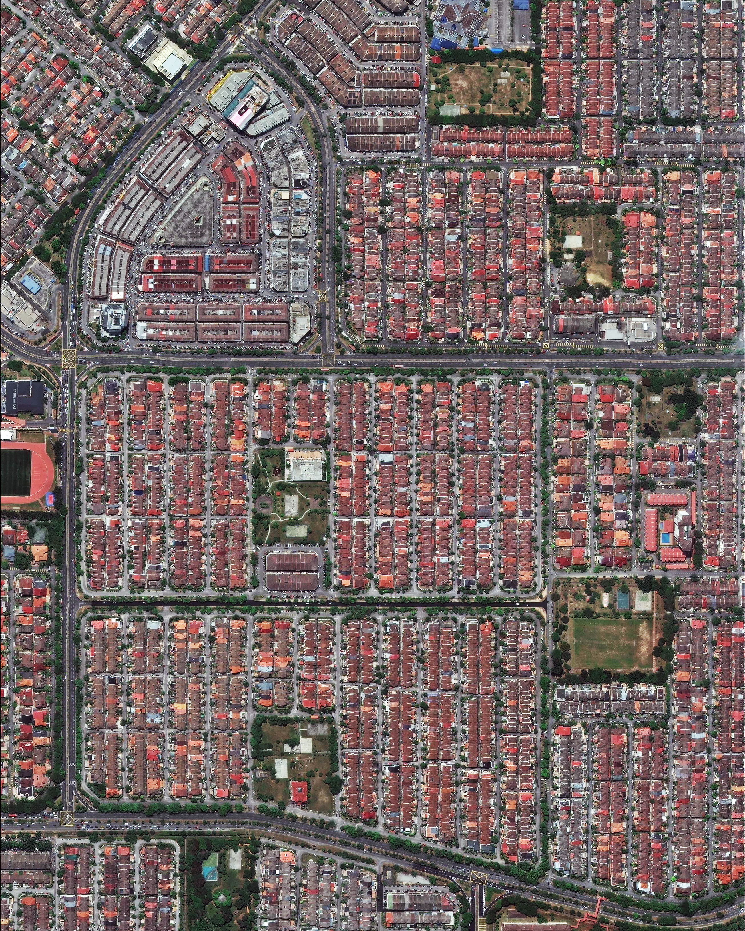 Palm tree plantations surround the city of Kuala Lumpur, Malaysia. Oil-producing palm trees were introduced to the country in the 1970s in order to diversify the local agriculture, which was heavily reliant on the rubber tree at the time. The trees are cultivated in terraces, cut into the contours of hills, to avoid erosion caused by streaming water. Malaysia is now one of the world's largest suppliers of palm oil, exporting nearly 18 million tonnes per year.