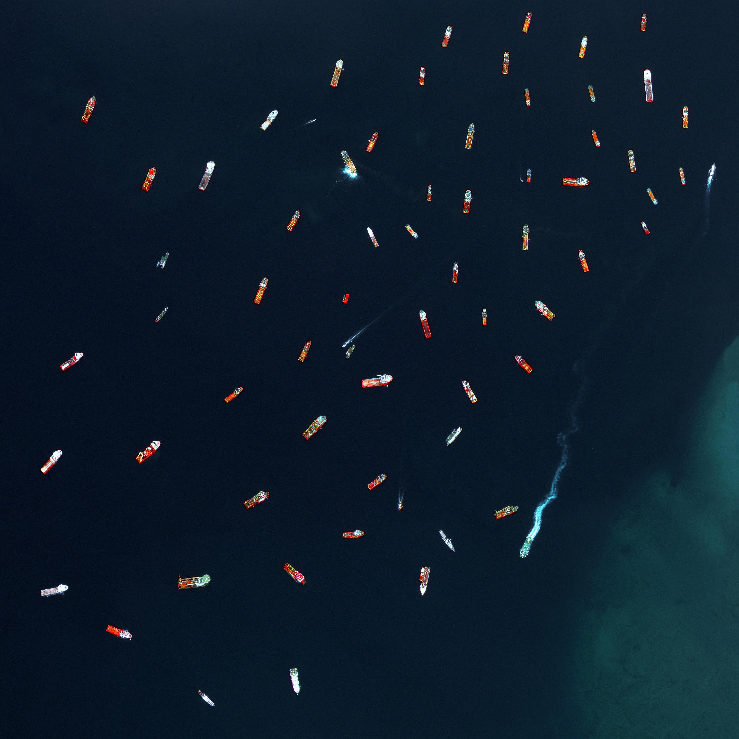 Oil field service ships anchor offshore of Labuan, a territory of Malaysia that is located off the coast of Borneo. In addition to being an offshore financial center, Labuan is a support hub for deepwater oil and gas activities in the region. The economy of Labuan is heavily dependent on its fossil fuel resources, which account for 65% of its exports.
