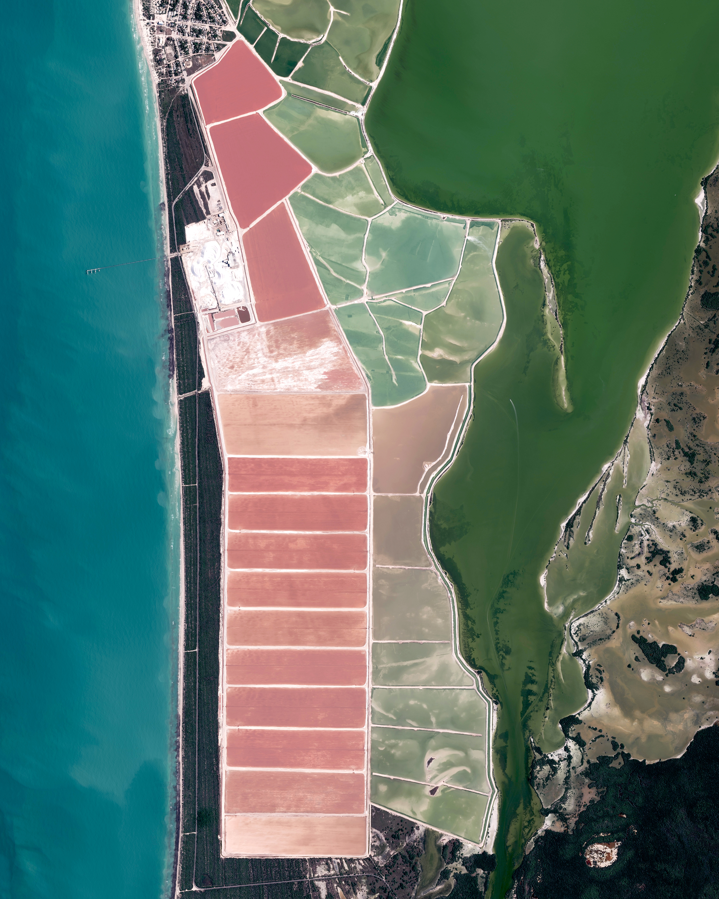 Huge sea salt evaporation ponds add color to the landscape of Las Coloradas, a community in Yucatán, Mexico. These ponds are part of an area that refines about 750,000 tons of sodium each year and produces six different types of table salt. The brilliant color of the water comes from salt-loving microorganisms, which serve as a source of food — and a source of pigment — for a thriving population of flamingos.